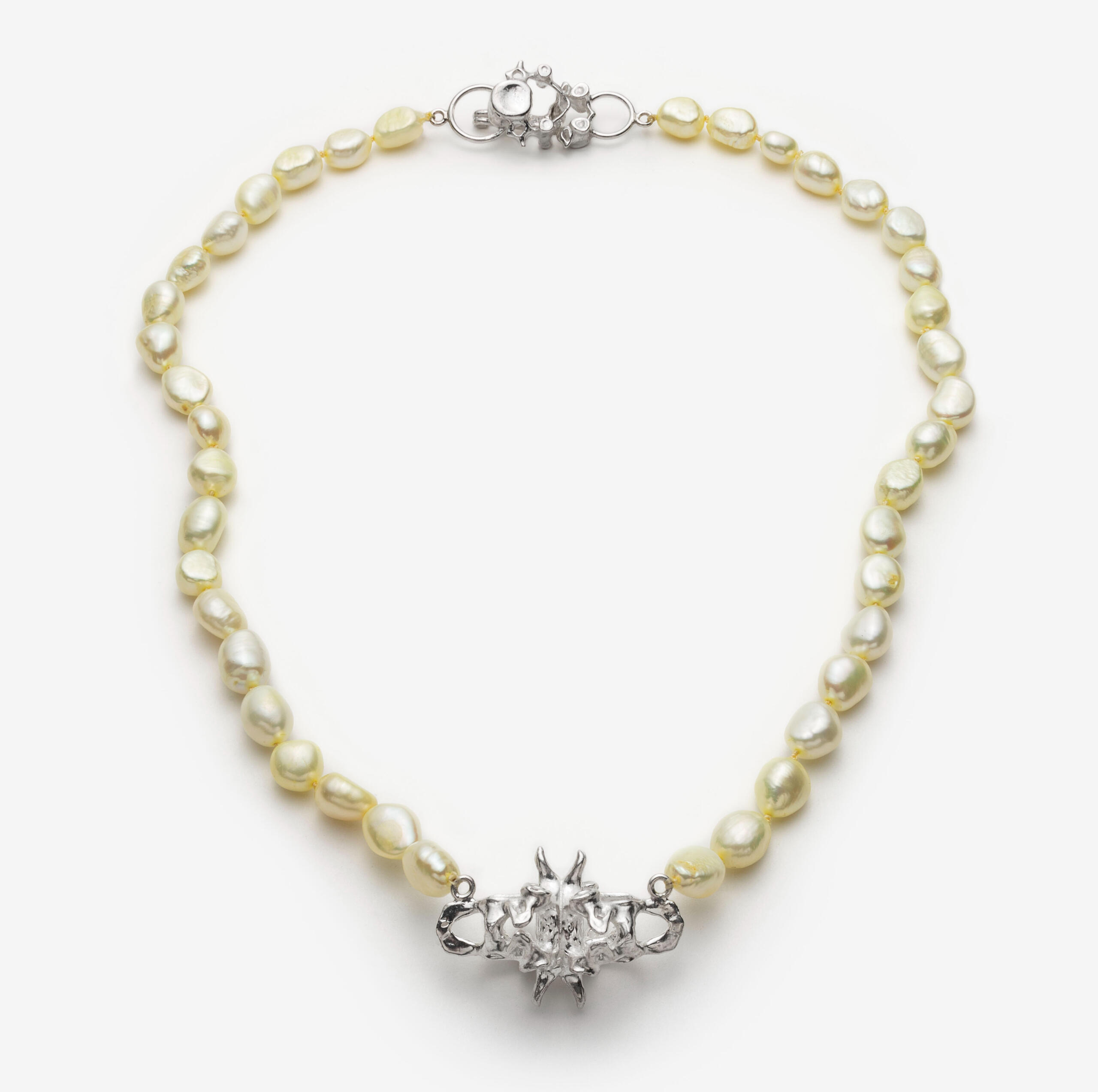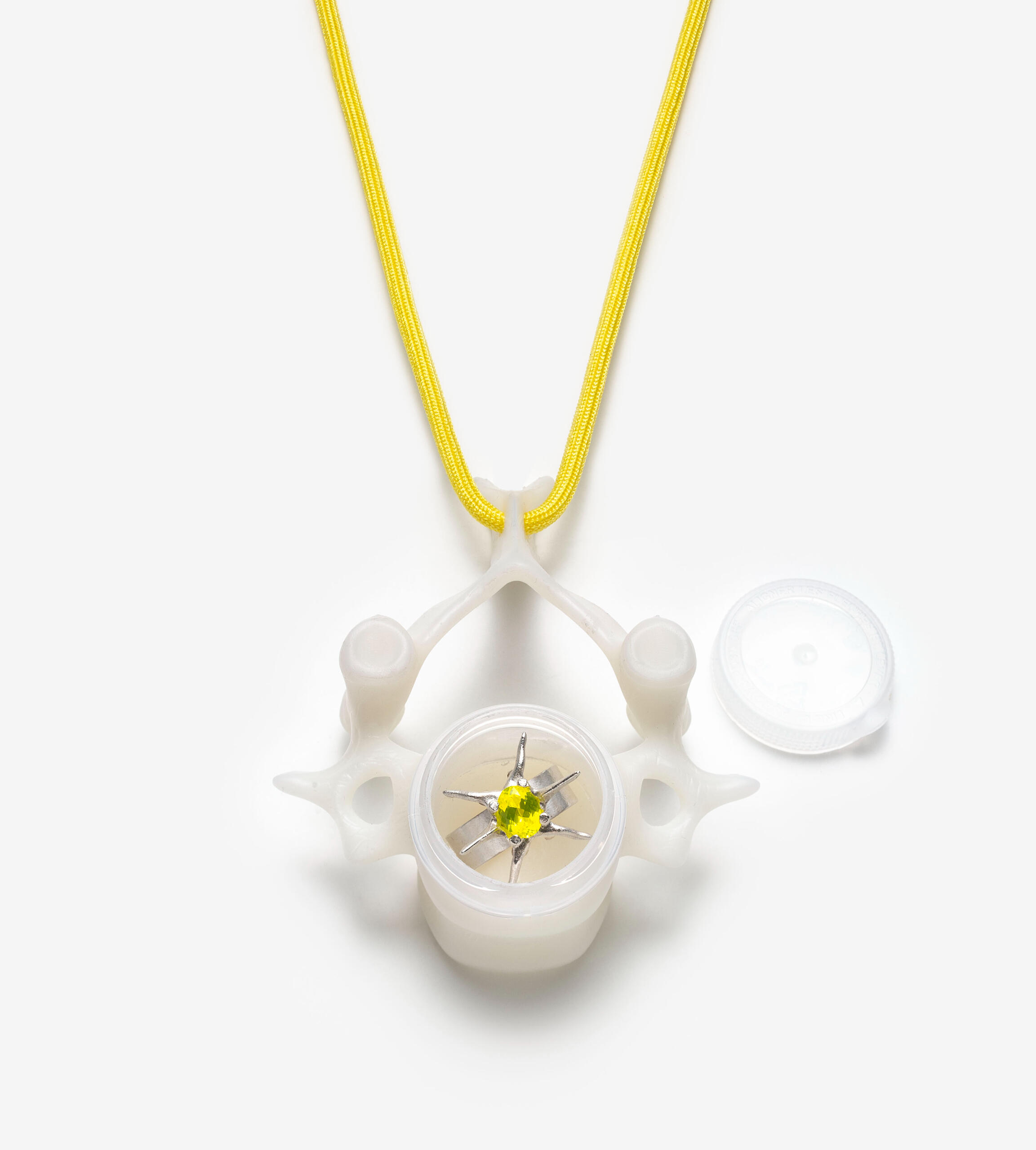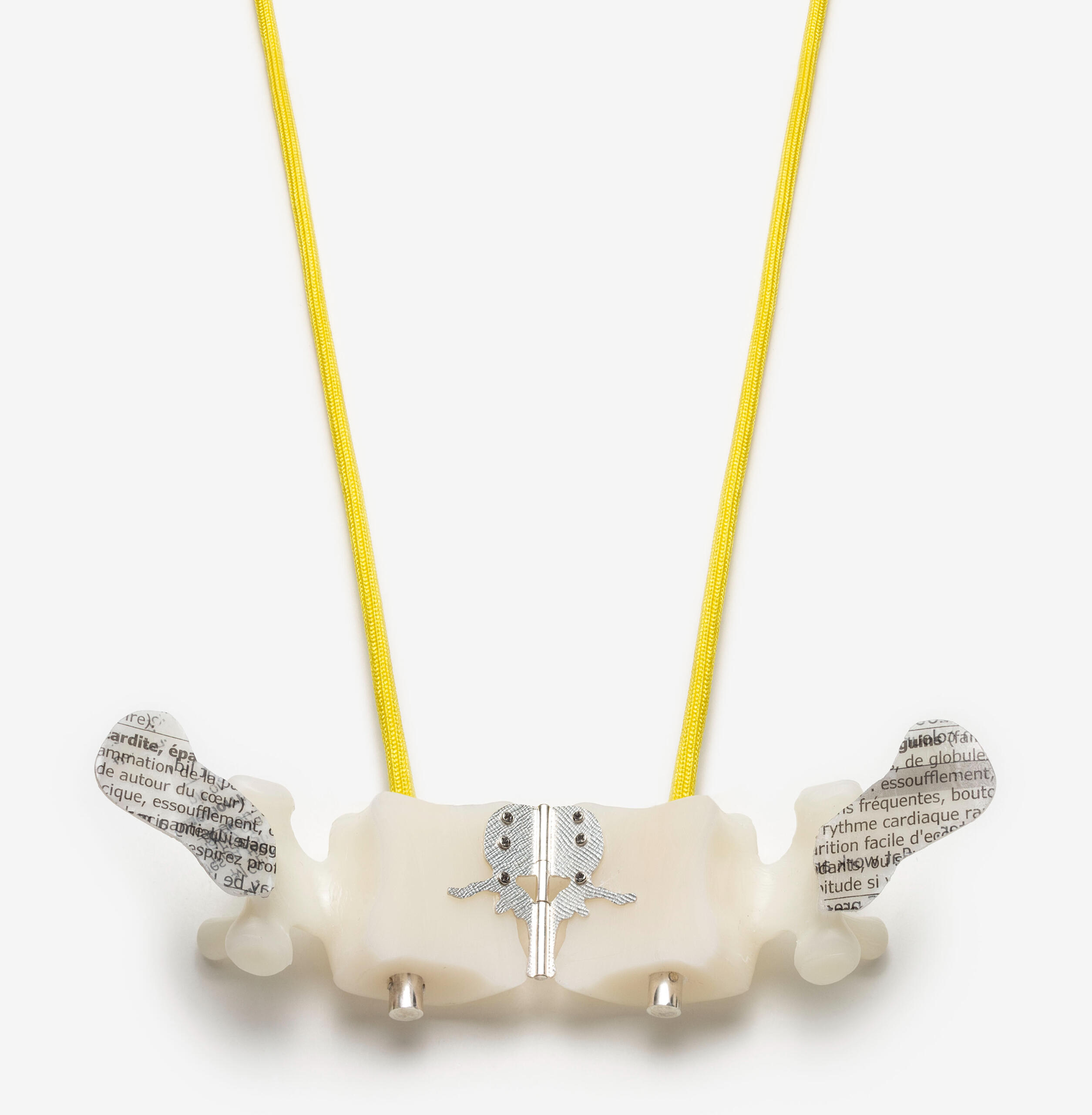 Finaliste au Prix François-Houdé et finaliste au prix Jean-Cartier avec cette collection.Démarche artistique:La conception de la collection Arthritis repose sur la volonté de traduire la spondylarthrite ankylosante, une atteinte de la colonne vertébrale à travers des bijoux qui allient symbolisme et esthétique. Chaque étape de création commence par une étude approfondie de la structure osseuse, en particulier les vertèbres, et des effets de la maladie sur celles-ci. L'artiste s'inspire des effets néfastes de la pathologie sur les vertèbres, tout en cherchant à intégrer des éléments qui rappellent la force et la résilience du corps humain.La résine et l'argent sterling sont choisis pour matérialiser cette dualité entre fragilité et robustesse. Certains éléments de la collection sont déformés, montrant les conséquences physiques de la maladie, tandis que d'autres conservent des formes plus saines, symbolisant l'espoir de guérison (contrôle) et de réhabilitation. Le choix de la couleur jaune fluorescent, omniprésent dans la collection fait écho à la médication et souligne le rôle central du traitement dans le processus de rétablissement.Chaque bijou est conçu pour évoquer une étape du parcours de soin, de la reconnaissance des symptômes à l'acceptation du traitement. Les textures osseuses et les inscriptions liées aux médicaments ajoutent une touche réaliste et personnelle, soulignant la lourdeur du processus tout en célébrant la force intérieure de ceux qui vivent avec la maladie. Le tout est pensé de manière à créer des pièces symboliques et évocatrices, qui allient esthétique, fonctionnalité et profondeur émotionnelle.Matériaux: résine, perles, argent 925, grenat GAGG, paracorde, vis en acier, capsule de médicaments.