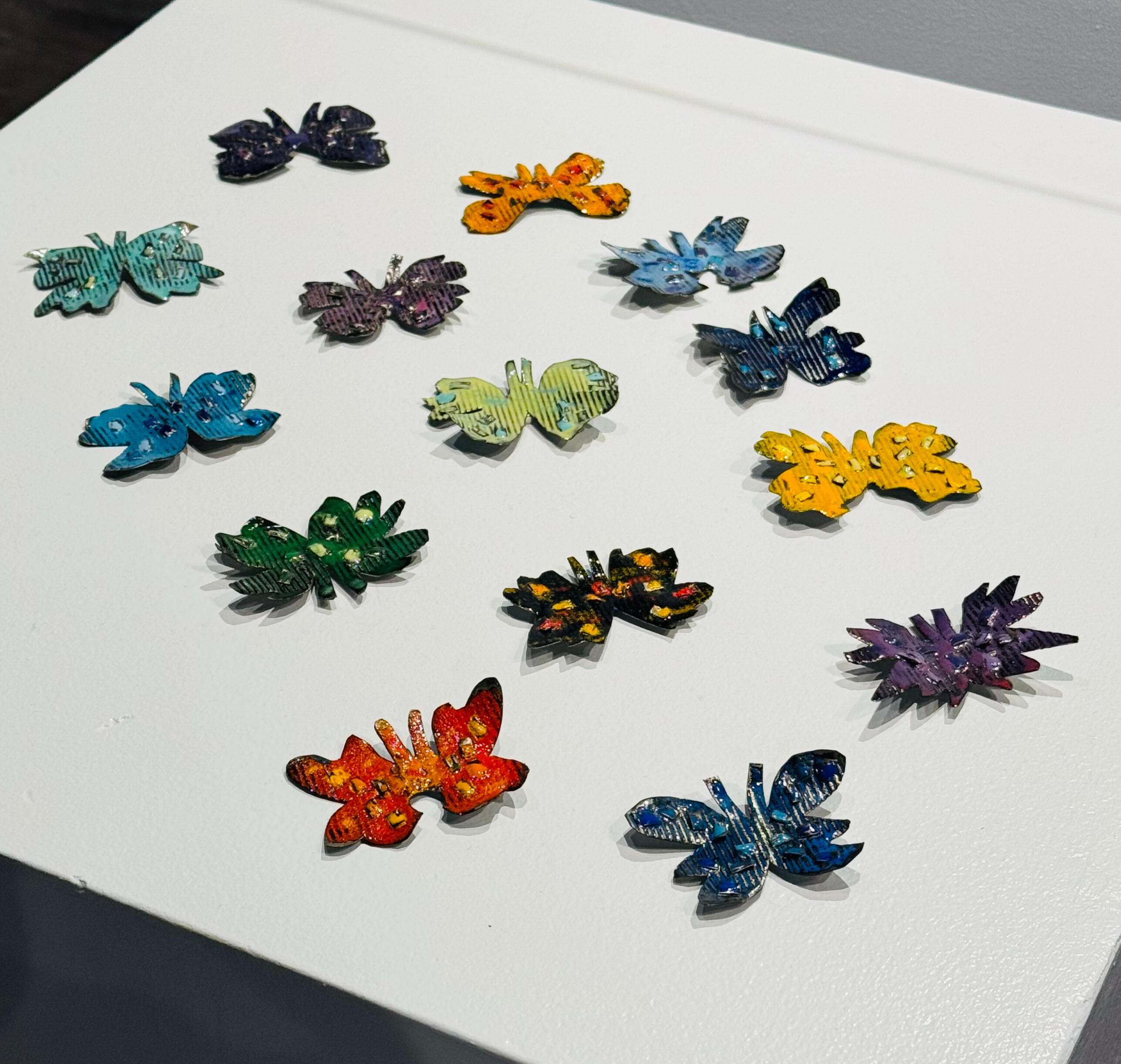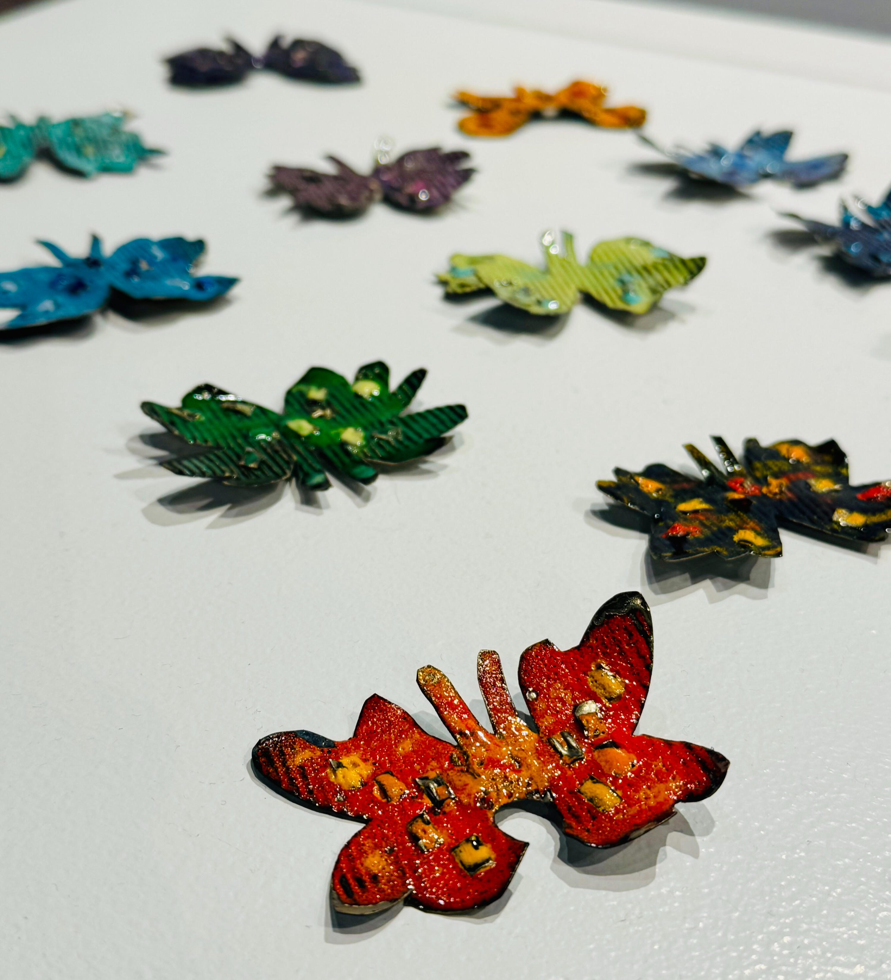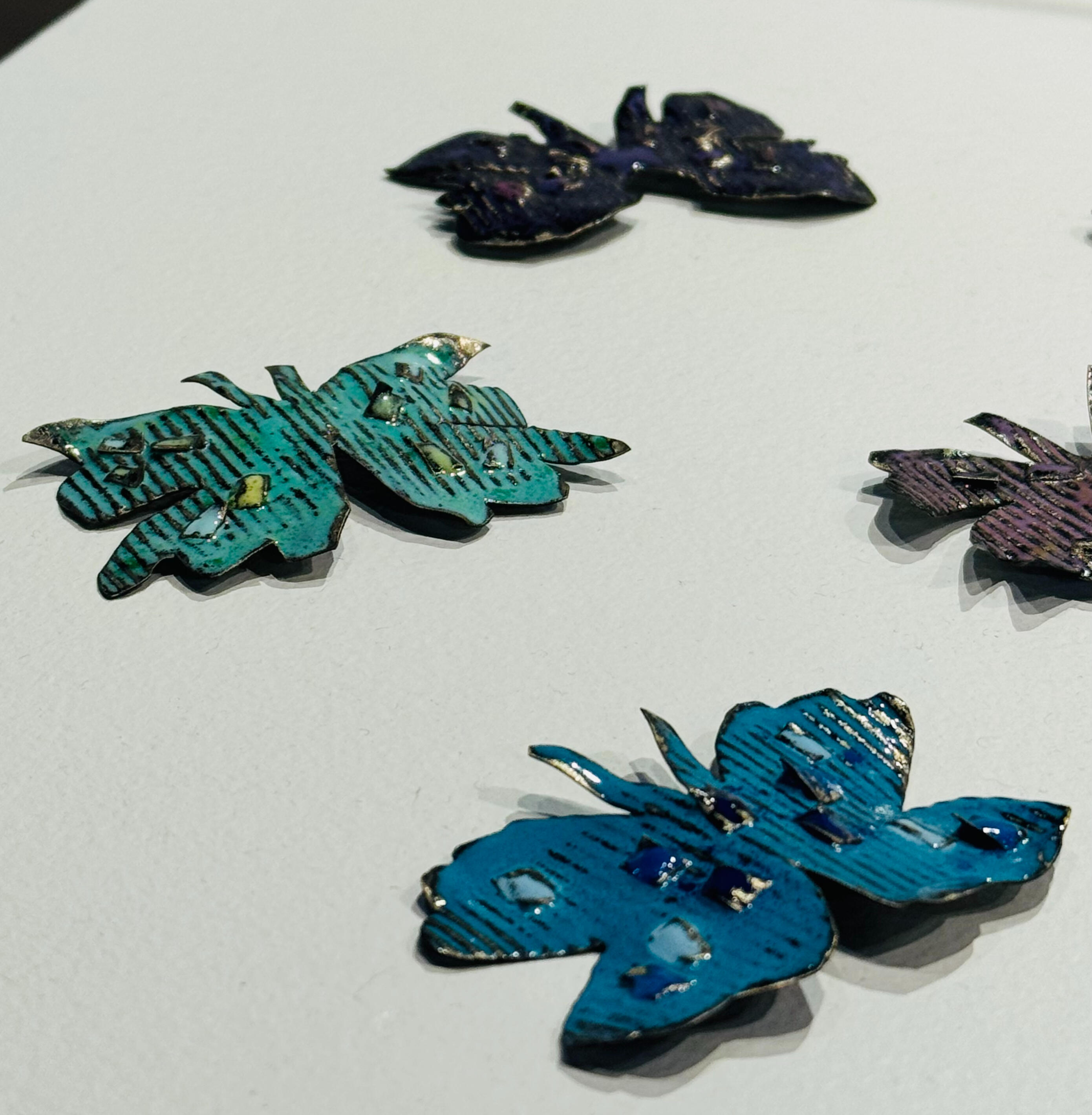 Dans ma pratique du bijou contemporain, je m’intéresse aux thèmes de la famille, du temps et de la santé. J’essaie d’exploiter ces thématiques en conservant une certaine naïveté et surtout, une candeur.La collection Parcelles d’éternité aborde ma relation au temps, mon sentiment d’être maintenant éternelle grâce à la présence de mes petites-filles. Chaque pièce de cette collection est inspirée du papillon et de sa métamorphose complète (œuf, chenille, cocon, papillon…).Les papillons présentés appelés "Spécimens uniques et vulnérables" sont découpés dans la tôle ondulée, avec des cisailles, inspiré des flocons de neige découpés habituellement par les enfants. Il y a dans le geste une spontanéité et une naïveté. L’activité est ludique, la forme naissant dans le pli, résulte de l’intuition. La tôle ondulée, d’apparence industrielle, une fois découpée, devient légère, presque fragile. Je recouvre ensuite les papillons d’émail, apportant couleurs, lumière et une apparente préciosité. L’émail fige la surface tout en révélant ses aspérités, créant un contraste entre solidité et délicatesse. Ces bijoux sont volontairement fragiles. Comme les véritables papillons, ils ne supportent pas une manipulation excessive : les ailes peuvent se plier, s’abîmer, se transformer. Cette vulnérabilité fait partie intégrante de l’œuvre.Porter le papillon, soutenu par un aimant, c’est accepter sa possible altération, et reconnaître la beauté du vieillissement, la valeur de cette étape de vie, qui révèle la structure comme un bijou en soi.Il est aussi possible de collectionner les papillons et les épingler tel un entomologiste.Matériaux: tôle, émail, argent, aimant